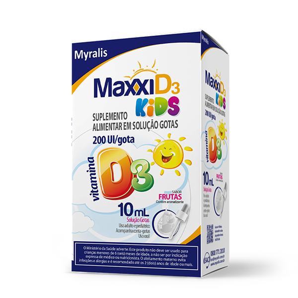 Maxxi D3 Kids foi formulado para crianças que tem carência de Vitamina D no organismo ou não alcançam a recomendação diária apenas com a alimentação. É indispensável a Vitamina D no organismo porque ajuda no desenvolvimento dos dentes e ossos tornando-os mais resistentes. Maxxi D3 Kids é um suplemento vitamínico a base de vitamina D3 recomendado para a prevenção dos estados de carência dessa vitamina em lactentes até 18 meses que não se expõe as sol e crianças que não alcançam a recomendação de ingestão diária apenas com a alimentação, por isso é necessária a suplementação com vitamina D3 tornando-a indispensável em qualquer época da vida. A vitamina D3 facilita a absorção de cálcio da dieta para a corrente sanguínea e para o deposito de cálcio nos ossos, essencial para o desenvolvimento. Atua também no matabolismo do fósfora, previne o raquitismo e na prevenção auxiliar da desmineralização óssea mantendo os osso e dentes em bom estado. Modo de uso Ingerir 1 gota ao dia ou a critério médico ou nutricionista.